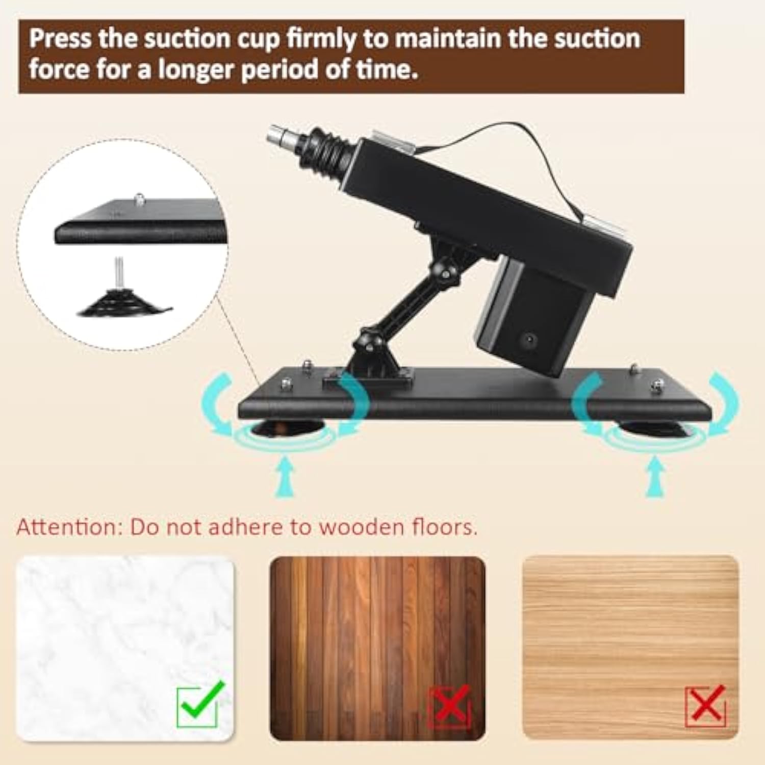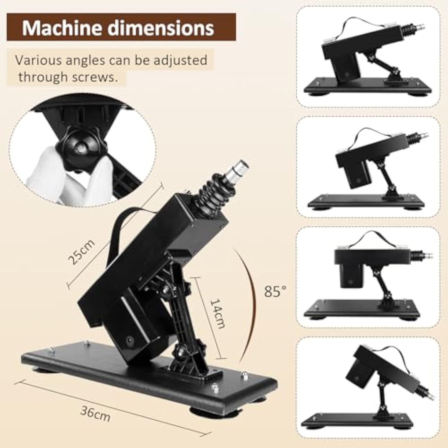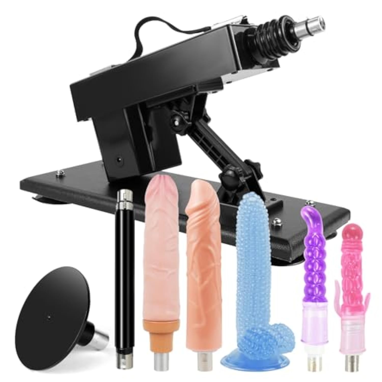 | Automatic Thrust Piston : This Machine Combines With Dildo Attachments And Thrust By 4.5 Cm. The Speed Is Adjustable And Offers Different Modes Such As Low, Medium And High. You Can Quickly Immerse Yourself In The Atmosphere Without Having To Push Manually. | | Adjustable Angle 85 °: The Position Of The Two Screws Can Be Adjusted At The Same Time, The Maximum Tilt Angle Is 85°. Adjust It According To Different Positions To Find The Perfect Environment For Your Mood And Preference. | | 7 Practical Attachments : Including 5 Different Dildo, 1 Suction Cup Adapter And 1 Extension Rod. In Total, There Are 7 Sex Machine Attachments That Can Be Connected To Other Suction Toys Via The Adapter. | | Foldable Suction Cup : The 4 Foldable Suction Cups Can Be Pressed Firmly To Create A Non-Slip Effect And Can Also Be Folded. This Sex Machine Is Different From Traditional Manual Toys And Frees The Hands, Get Powerful Sexual Pleasure! | | Thrusting Sex Toy Men/Women Use : Suitable For All Adult Men, Women Or Couples. You Can Use It Alone Or Let Your Partner Take Control Of Your Pleasure. Water-Soluble Lubricant Will Greatly Enhance The User Experience. | |