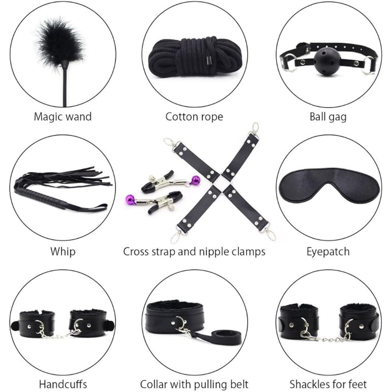 - Kit Of 10 Pieces: This Complete Kit Comes With A Magic Wand, A Cotton Rope, A Bll Gag, A Whip, A Cross Strap, 2 Nipple Clamps, A Eye Patch, Handcuffs, A Collar With A Pulling Belt And Shacked For The Feet.