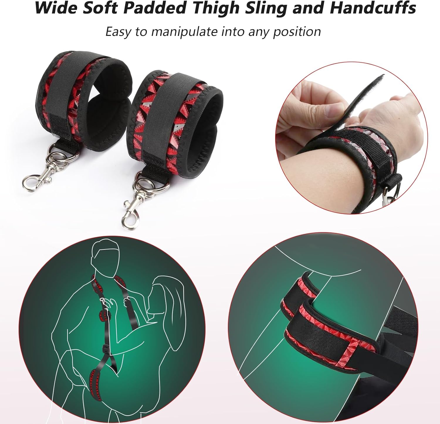 Adjustable & Detachable Handcuffs – The included BDSM handcuffs are detachable and can be used independently or with the thigh sling. The adjustable Velcro straps ensure a secure fit while allowing for easy adjustments.