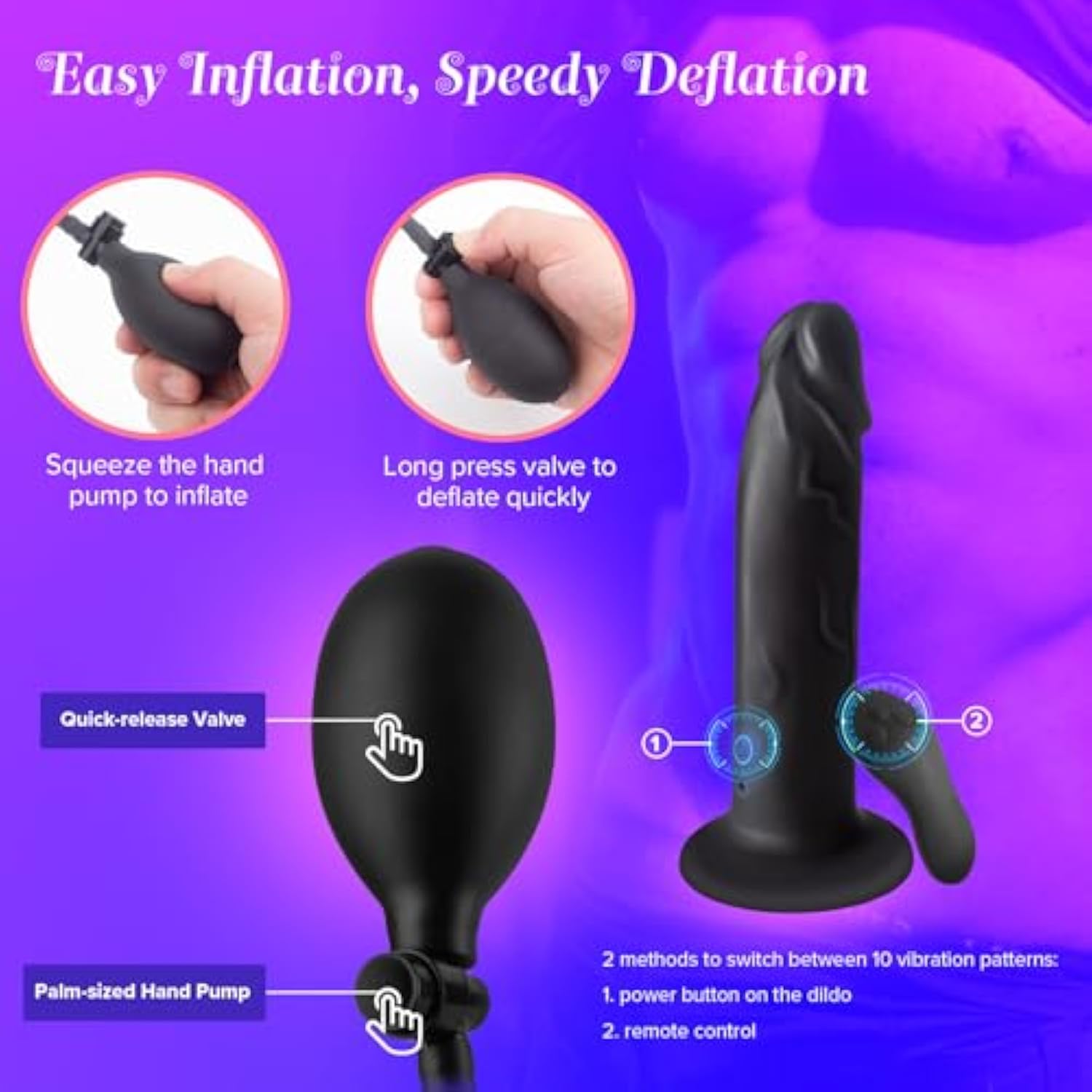 - ?Infation+Vibration=Thrilling Sensation Easy To Use?: Inflatable Dildo Offer A Filling Sensation, Our Male Sex Toy Combines It With 10 Vibration Modes, Creating A Sensation Everybody Love. Squeeze The Hand Pump To Expand, Quickly Deflate The Dildo By Pressing The Quick Release Button At The Top Of The Valve. You Can Decide The Size. Male Sex Toys Inflate Throughout The Entire Shaft. The Vibration Tingles Quite Strongly Around The Entire Inflated Surface, And It Doesn'T Make Much Sound Either.