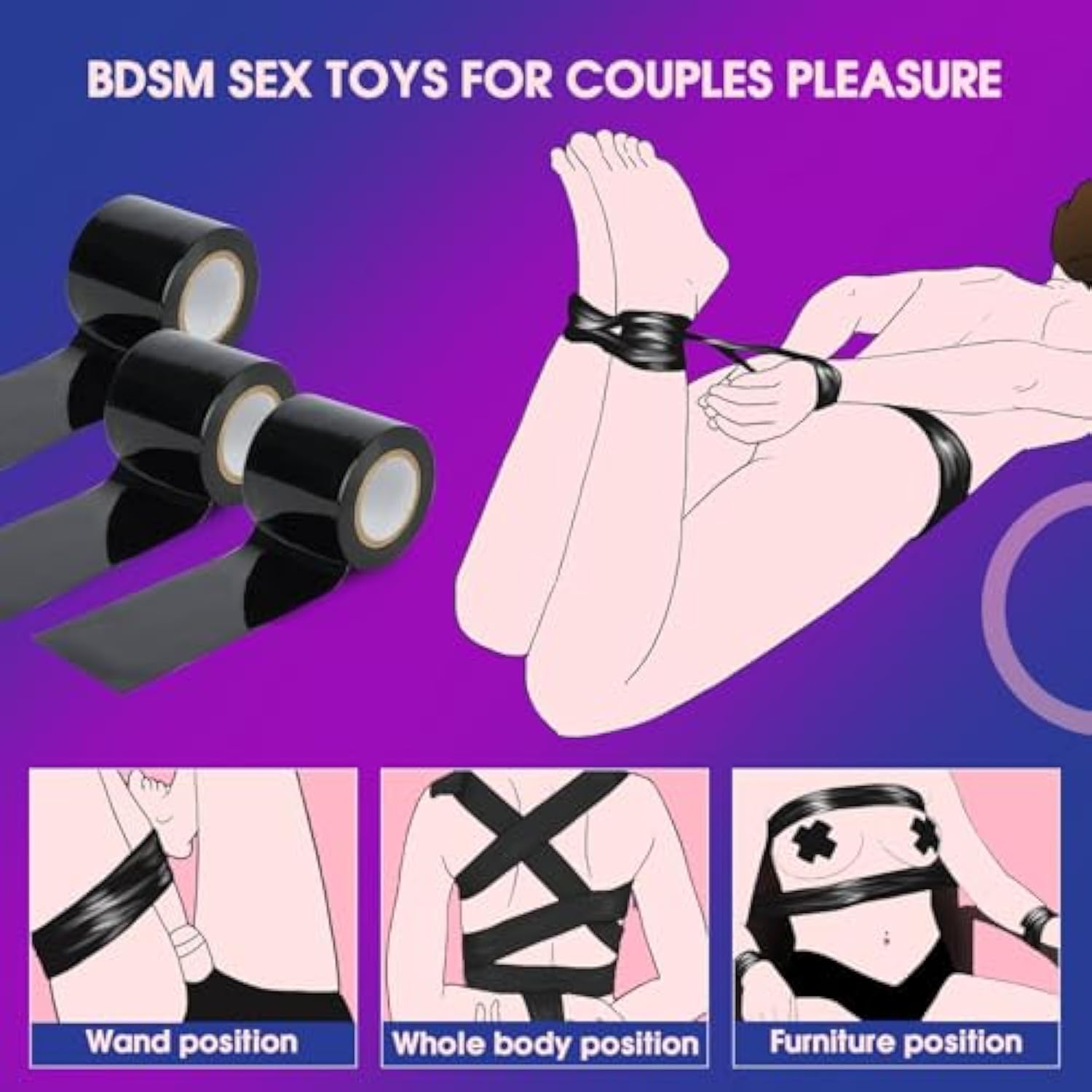 | Electrostatic Bonding?Pvc Bdsm Tape Has No Glue And Taste,Won'T Leave Any Glue Residue On Your Body Or Hair,You Don'T Have To Worry About It Pulling Your Hair Or Leaving Any Sticky Residue.Won’T Cause You Hurt When Pell It Off,It Will Be Your Impeccable Choice To Explore Bdsm World. | | High Quality Materials:Bondage Tape Is Made Of High-Quality Pvc Plastic,It Only Sticks To Itself. The Flexible High-Quality Pvc Makes It Difficult To Escape. The Soft Characteristics Make Your Lover Comfortable Even In Restraints.The Blindfold In The Bondage Set Is Made Of Soft Silk Scarf, Which Adds More Mystery When Losing Vision. | | Multiple Restraint Methods:Bondage Tape Can Be Used To Gag, Cuff Hands And Feet, Restrain Your Partner Into Any Position You Like.Bondage Tape Set Is One Of The Most Versatile And Inexpensive Bondage Restraints You Can Purchase. It Comes In 3 Colors And Blindfold.It Can Restrain Any Part Of Your Partner. | | Impeccable Bdsm Toys For Beginners:65Ft*3 Rolls,Bondage Tape Can Be Reused Many Times. You Don'T Need To Know Any Bondage Knots To Use It Effectively. Unlike Most Blindfolds Or Gags, Kinky Tape Doesn’T Grip Or Tear At Hair. This Can Make It A Good Fit When Someone Has A Sensitive Scalp. | | Bdsm Kit Sex Toys For Couples:Whether Beginners Or Experienced Bondage Enthusiasts,You Can Make Suitable Restraints In Seconds With Our Bondage Tape.You Can Use It For Full-Body Bondage.They Looks Like Regular Tape, No One Will Question It When They See A Roll Of Tape For Bondage Lying Around. | |