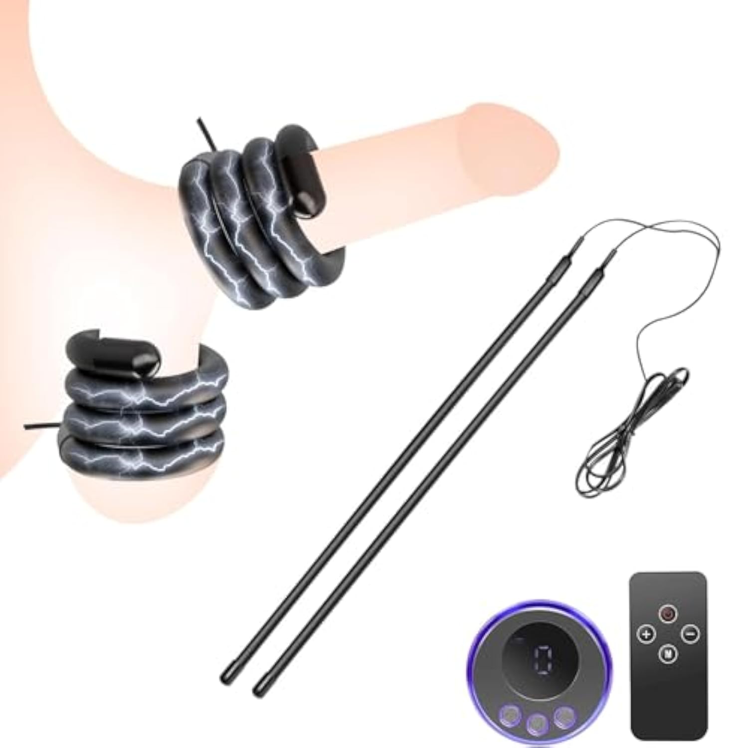 | Flexible Adjustable – Soft Conductive Silicone With A Built-In Metal Wire Allows Easy Wrapping Around The Penis And Testicles, Ensuring A Customizable Fit. | | Electro Shock Stimulation – 8 Modes 19 Intensity Levels Let You Explore Everything From Gentle Tingles To Intense Estim Pleasure. | | Remote Control – Enjoy Hands-Free Control Up To 49Ft (15M) Away, Perfect For Solo Or Partner Play. | | Premium Material – Made From Skin-Safe Conductive Silicone, Easy To Clean And Store. | | Universal Fit – Adjustable Ring (14In/355Mm), Control Unit (2.4In/62Mm), And Compact Remote (3.4In/86Mm). | |