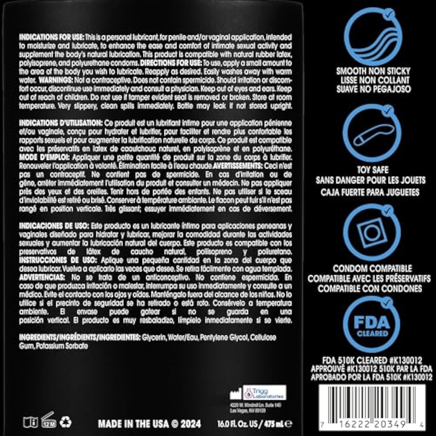 | Classic Water-Based Formula: Trusted For Over 35 Years, Original Water Based Formula Keeps Things Effortlessly Smooth Without Constant Reapplication. Long Lasting And Reliable, It’S The Perfect Companion For Moments That Go The Distance. | | Silky-Smooth Texture: With Its Luxuriously Smooth, Gel-Like Feel, Enhances Every Experience With Ease And Comfort. Say Hello To A Glide So Silky, You’Ll Wonder How You Ever Lived Without It. | | Compatible And Versatile: Safe To Use With Latex Condoms, Silicone Toys, And All Your Favorite Accessories, Is Ready To Keep Up With Any Adventure—Whether It’S On Dry Land Or In The Water. | | Premium Ingredients, Easy Cleanup: Designed To Be Gentle On Skin, This Lube Is Non-Sticky, Non-Greasy, And Easy To Rinse Off With Warm Water. No Residue, No Hassle—Just Silky Smooth Satisfaction Every Time. | | Made In The Usa: Proudly Crafted By Trigg Laboratories In A Cgmp-Compliant Facility, Original Is Backed By Over 35 Years Of Trust And Quality. While The Bottle May Have A Fresh New Look, The Premium Ingredients Inside Are As Dependable As Ever. | |