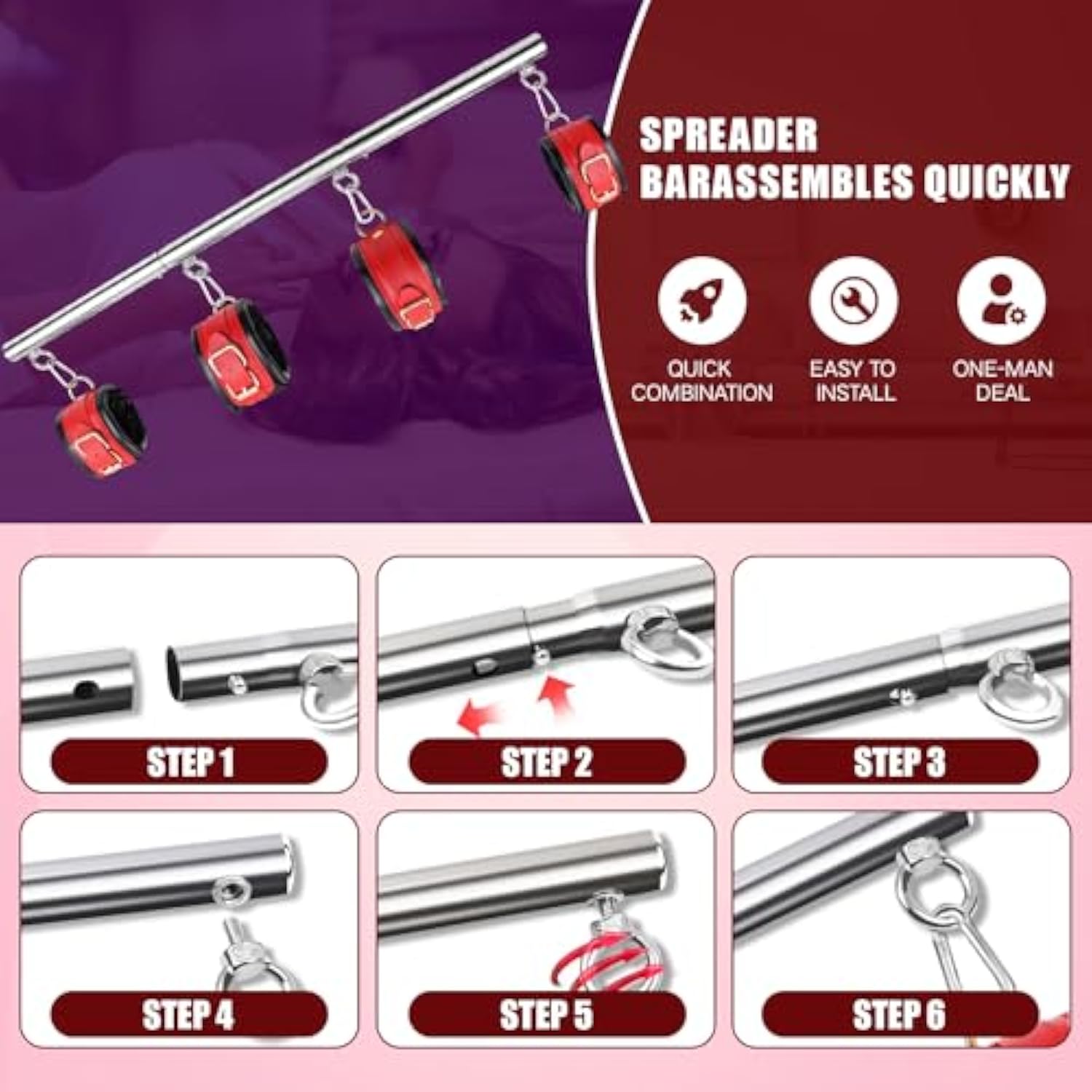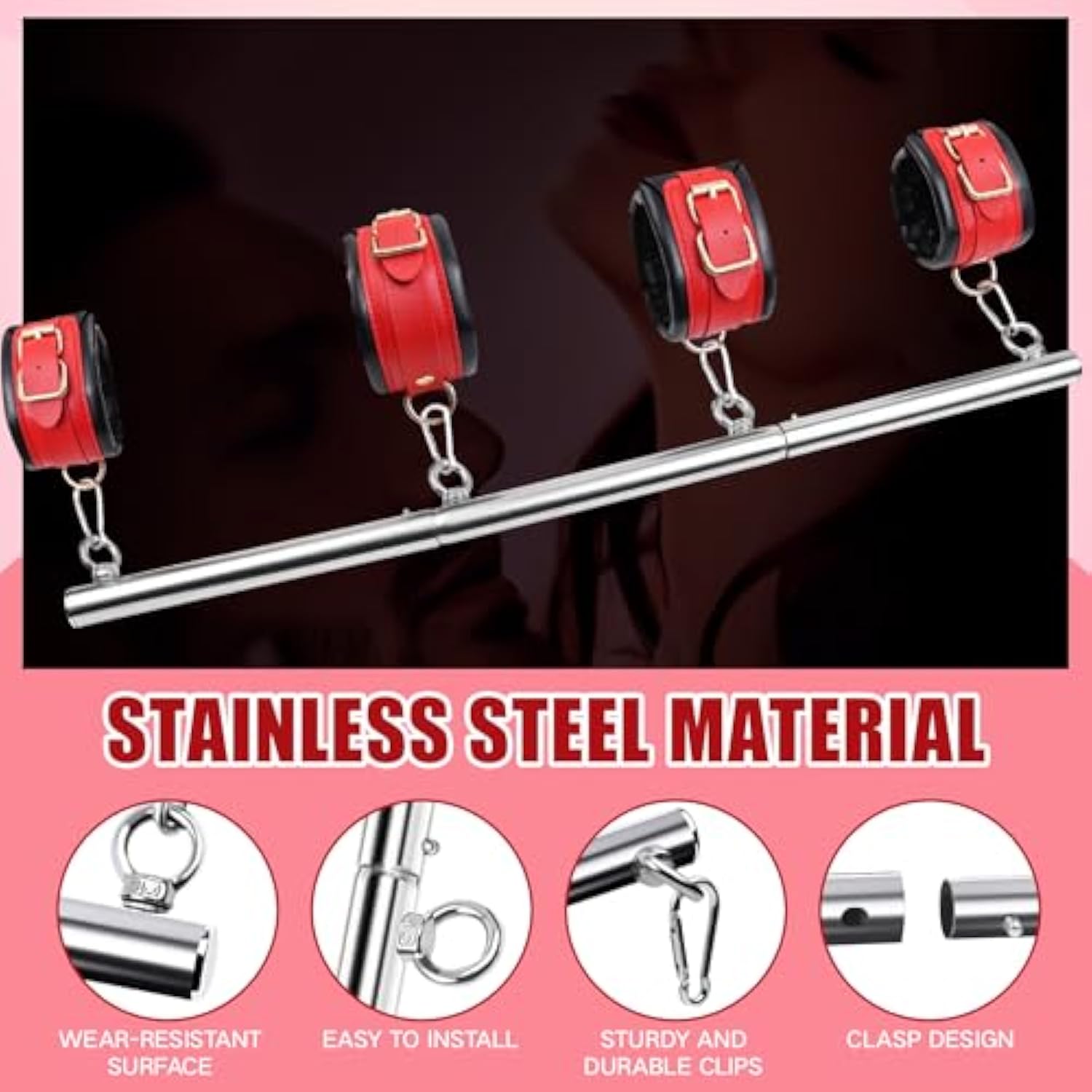 | Versatile Sm Restraint Set: This Sm Bondage Set Includes 2 Handcuffs, 2 Ankle Cuffs, 1 Neck Collar, 5 D-Ring Buckles, 7 Screws, And 5 Stainless Steel Rods. | | Secure And Comfortable Restraint Experience: Made Of Stainless Steel, Alloy And High Quality Leather, Safe And Durable. The Restraint Bondage Sex Toy Are Made From Imported High-Density Soft Leather With A Sponge Padded Interior Which Is Sturdy Enough To Avoid Tear. The Handcuffs, Ankle Cuffs, And Neck Collar Provide A Secure Hold While Ensuring Comfort During Various Bondage Positions. | | Adjustable And Detachable: The Versatile Detachable Spreader Bar And Buttons Are Made Of High Quality Stainless Steel Metal, Climbing Latch Design, Which Is Finely Crafted And Sturdy, So You Don'T Have To Worry About Damage. | | Upgrade New Version Spreader Bar: Unusually, We Have Two Spreader Bars For Even More Play, You Can Restrain Your Arms And Legs On One Long Bar Or Restrain Your Neck Wrists And Ankles On Two Bars At The Same Time. | | After-Sales And Hidden Packaging: The Product Is Packaged In Privacy, Our Discreet Packaging Is Worry-Free.Please Feel Free To