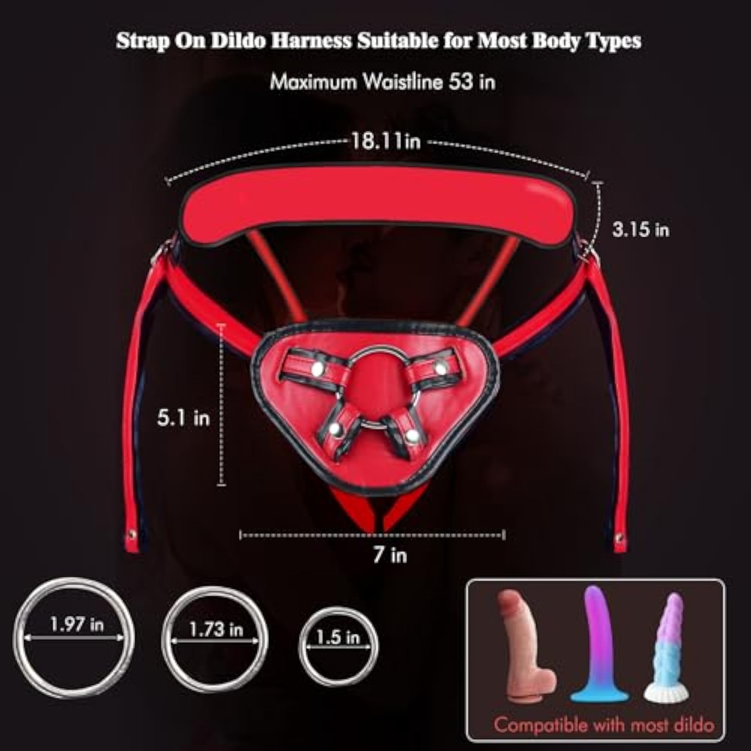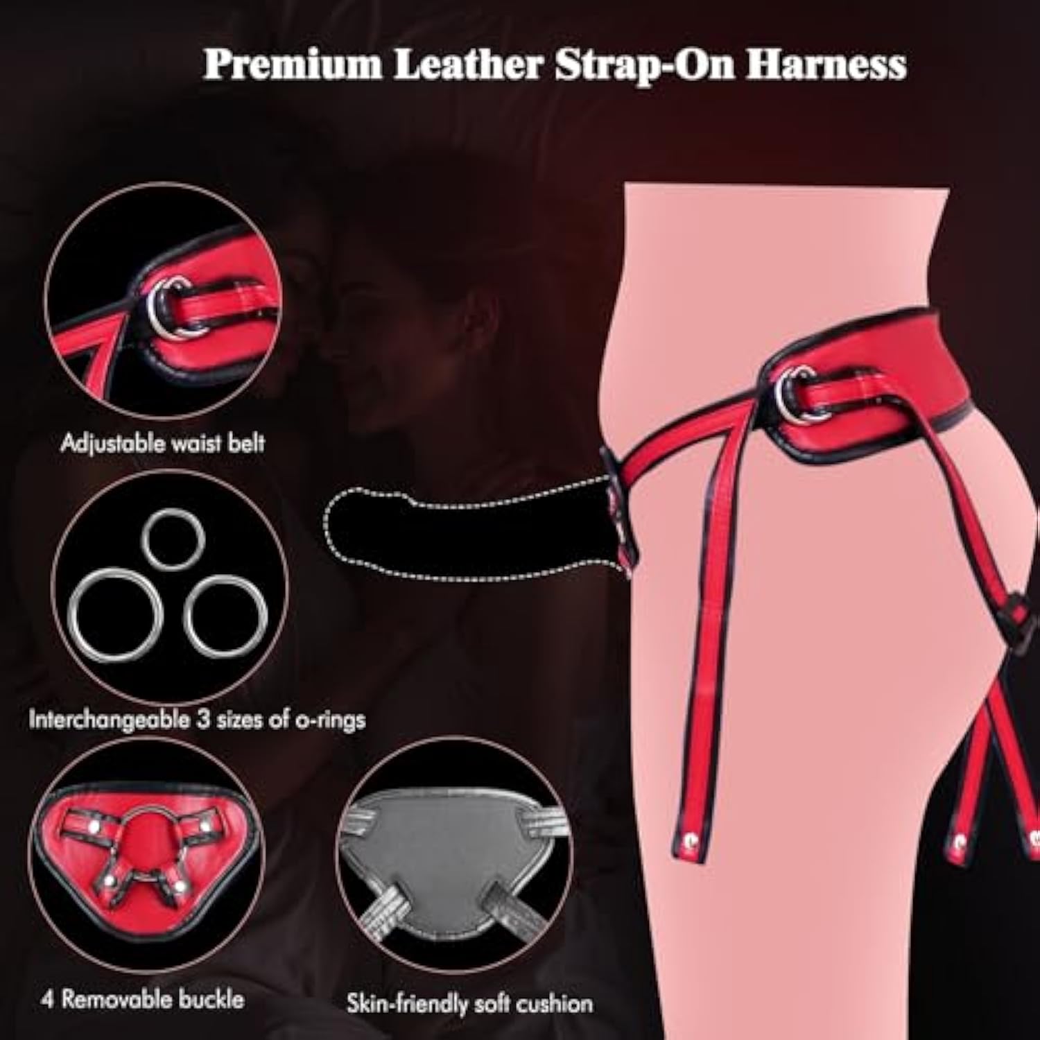 | Strapon Strap On Dildo With Removable Safety Strap: The Couples' Pleasure Set Is Made From Waterproof Leather With A Soft Plush Lining. This Harness Ensures Comfort And Style. Adjustable Straps Provide A Perfect Fit For Most Body Types. At The Same Time, The Wide Back And Sturdy Metal O-Rings Offer Excellent Support, Even For Heavier Dildos — Perfect For Lesbian Couples Exploring New Pleasures. | | Versatile Stylish Sex Harness: This Strapon Harness Includes Three Interchangeable Metal O-Rings (1.5In, 1.73In, 1.97In), Fitting Various Realistic Dildos, Large Dildos Or Small Sizes. Compatible With Suction-Cup Dildos And Flared Base Models, It Allows Easy Customization, Making It Ideal For Pegging And Tailored Experiences Based On Your Preferences. | | Easy To Adjust Strap-On Dildo: With Adjustable Waist And Leg Straps, This Harness Ensures Quick And Easy Customization. It Fits Waist Sizes From 20 To 52 Inches, Accommodating Most Body Shapes. Whether A Beginner Or Experienced, You’Ll Love The Secure, Comfortable Fit And Simple, Hassle-Free Setup. | | Premium Materials Sex Straps: Crafted From Durable, Go*D-Quality Leather, This Harness Feels Luxurious And Long-Lasting. The Side That Touches Your Body Features A Soft, Plush, Skin-Friendly Lining, Preventing Irritation And Ensuring Maximum Comfort During Extended Wear. These Beautifully Designed Sex Straps Are For Lesbian And Female Couples. You Can Try Pegging, Anal Play, Bdsm, Mutual Stimulation, Or Fantasy Role-Play, This Sex Toy Will Inspire Exploration And Shared Pleasure. | | Adjustable Support Harness Sex Toys: This Leather Sex Harness Is Waterproof And Can Be Easily Cleaned By Just Rinsing With Water. You Can Plan On Pegging, Hands-Free Penetration, Or Wear A Strap-On Dildo; This Strap-On Has You Covered. This Stylish Leather Dildo Harness Is Discreetly Packaged And Delivered Discreetly. | |