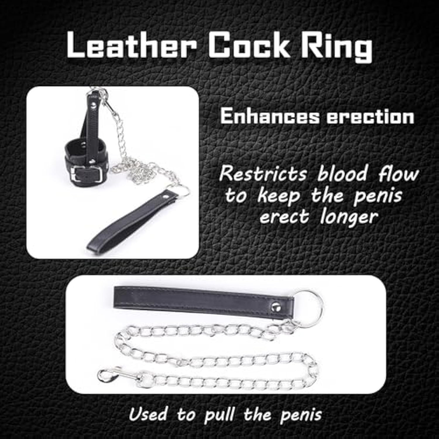 - [Penis and Ball Stretching]: This comes with a metal leash for leading. The leather cock ring fits the penis perfectly because it is adjustable. When you tug on the leash, it's punishment for him and sexual stimulation.