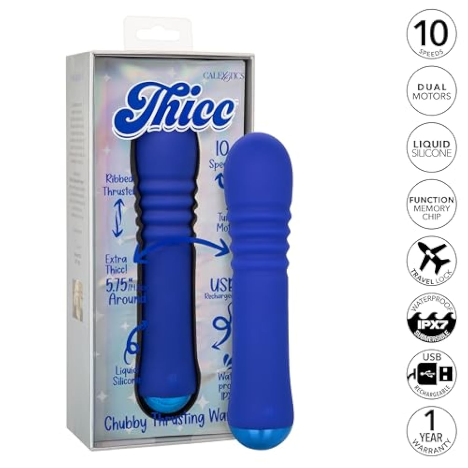 Turbo Charged Dual Motor Massager With Ultra-Thick 5.75 Inch (14.5 Cm) Shaft Circumference And Liquid Silicone: Softer, Smoother, Durable And Waterproof | | Thrusting Shaft Hugs Every Curve | | 10 Escalating Speeds Of Vibration And Thrusting Action | | Memory Chip Resumes On Last Function Used And Security Travel Lock Feature – Hold For 3 Seconds To Turn On Or Off | | Usb Rechargeable – Charging Cord Included; Complete Charge In 3 Hours; Runs For 55 Minutes On High Speed And 80 Minutes On Low Speed; 1-Year Manufacturer | |