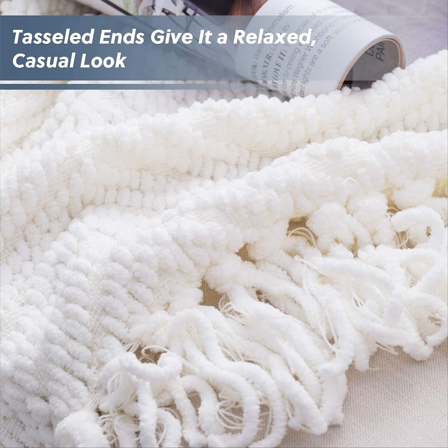 Throw Blanket For Couch – Cream White Versatile Knitwoven Chenille Blanket For Chair – Super Soft, Warm & Decorative Blanket With Tassels For Bed, Sofa And Living Room (Ivory, 50 X 60 Inches)