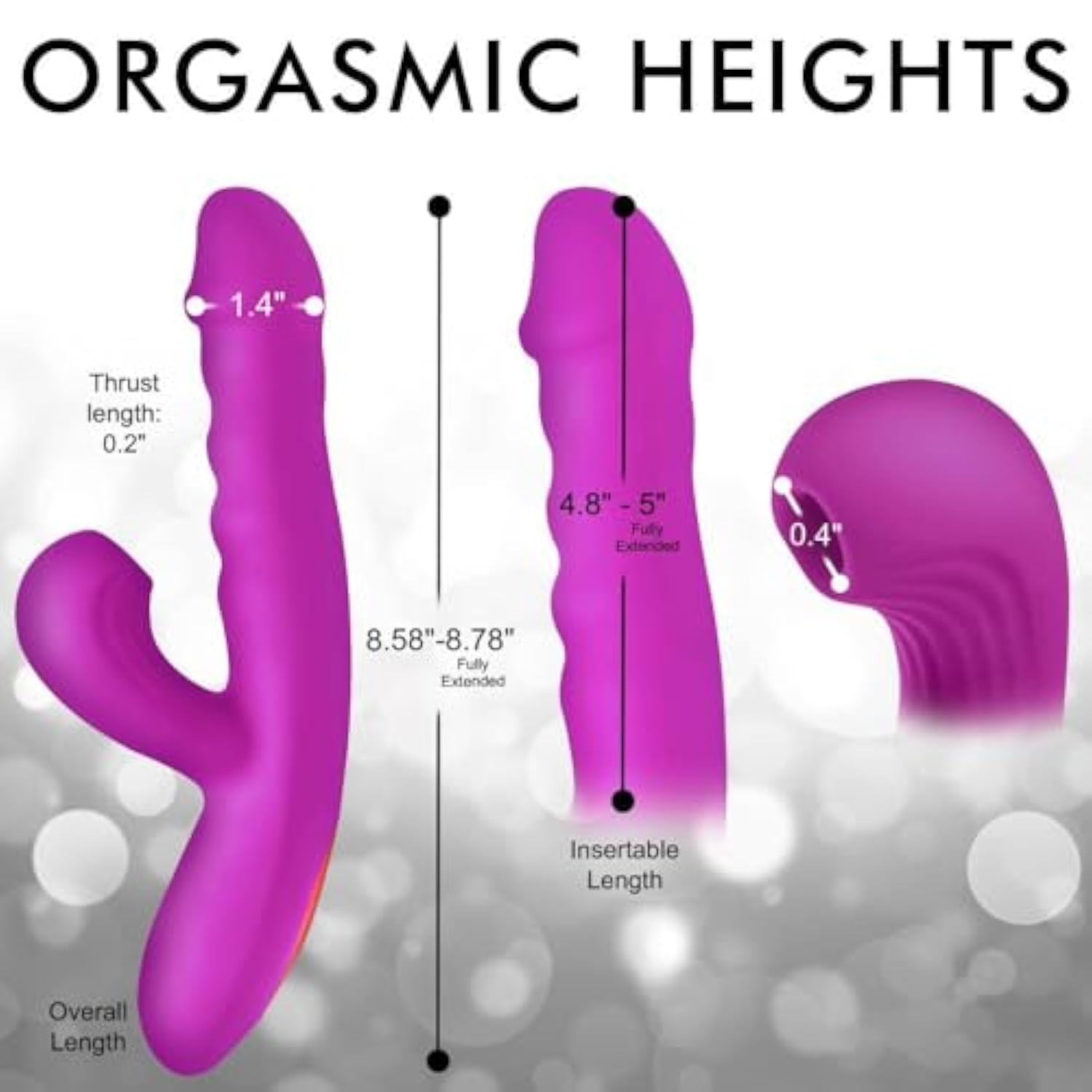 | Powerful And Customizable: Our Pleasure Tool Boasts A Long, Ribbed, And Thick Shaft With A Realistic Head, Delivering Intense Pleasure. With 2 Speeds And 8 Patterns Of Thrusting And Vibrating Options, You Can Easily Customize Your Experience To Match Your Desires. | | Dual Stimulation Delight: Indulge In The Ultimate Pleasure Experience With Our Thrusting And Sucking Rabbit Vibe. This Versatile Toy Is Designed To Target Your Hooded Gem Of Pleasure While Simultaneously Providing Gentle Internal Pounding For Complete Satisfaction. | | Seductive Sucking Sensation: Experience The Irresistible Combination Of Thrusting And Seductive Sucking. Enjoy An Additional 3 Speeds And 7 Patterns Of Powerful Suction That Will Take You To New Heights Of Pleasure, Leaving You Breathless And Fully Satisfied. | | Premium Quality And Easy Maintenance: Crafted From Silky Smooth, Phthalate-Free, And Body-Safe Silicone, Our Toy Ensures A Luxurious And Safe Experience. It Is Splashproof (Ipx5 Rated), Making It Suitable For Use In The Shower. | | Proudly Made In The Usa: Our Toy Is Meticulously Crafted In The United States, Ensuring The Highest Quality Standards. Trust In The Expertise And Dedication Of American Craftsmanship For A Premium Product You Can Rely On. Your Privacy Is Our Priority. The Product Comes In Discreet Packaging With No Sensitive Words Displayed. | |
