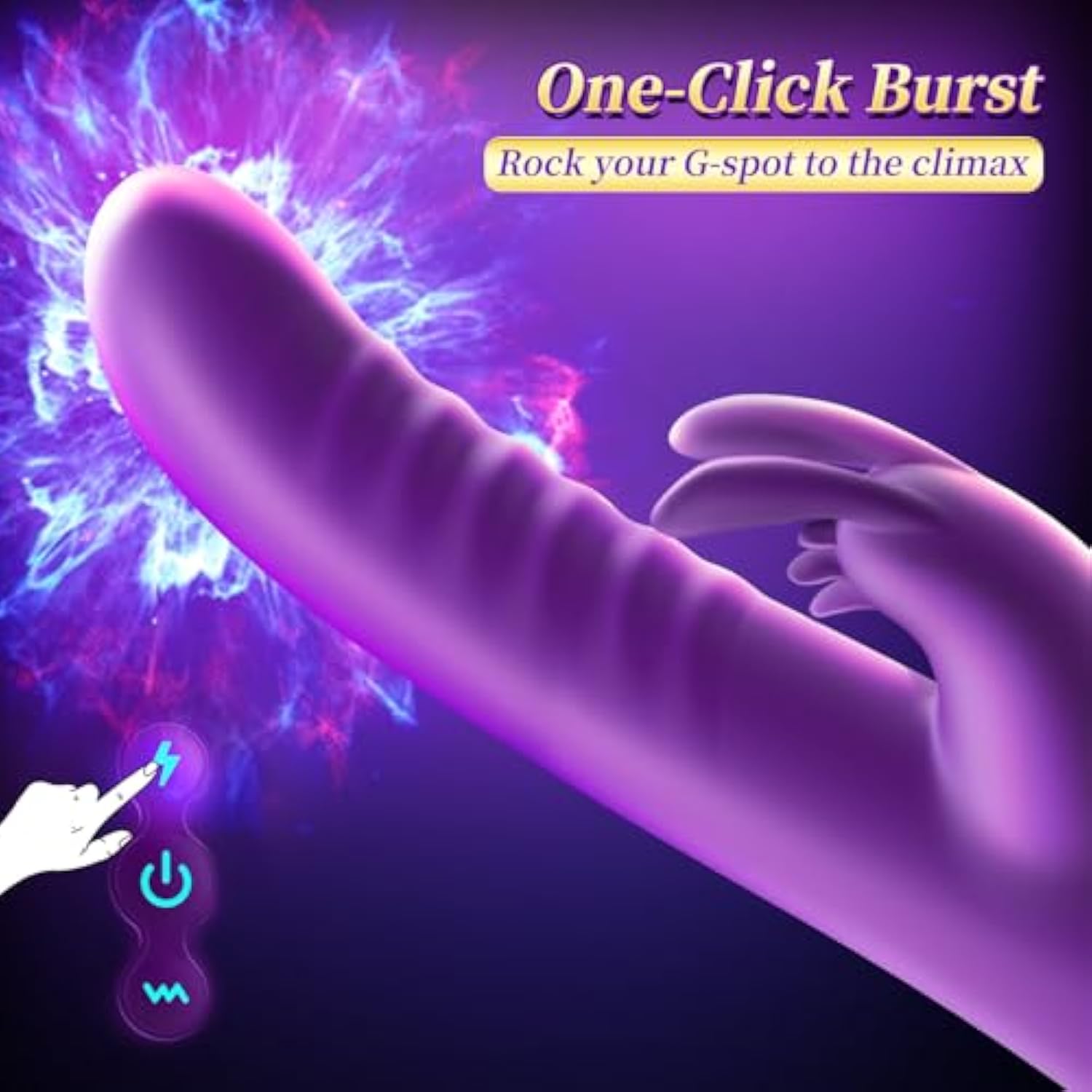 - ?One-Click Burst Mode Vibrator Quickly Get The Climax?Different From Other Sex Toys,Our Couples Sex Toys For Women Has A One-Click Burst Function.It Can Instantaneous Reach The Highest Level,Allowing You To Quickly Experience The Most Powerful Thrusting And Vibration Experience.The Soft Rabbit Ears And Tongue Will Constantly Tap And Lick Your Clitoris,And This Thrusting Dildo Will Quickly Rub The Vagina And Bring A Strong Vibrate,So That You Reach The Peak Of Orgasm,Like Flying Above The Clouds