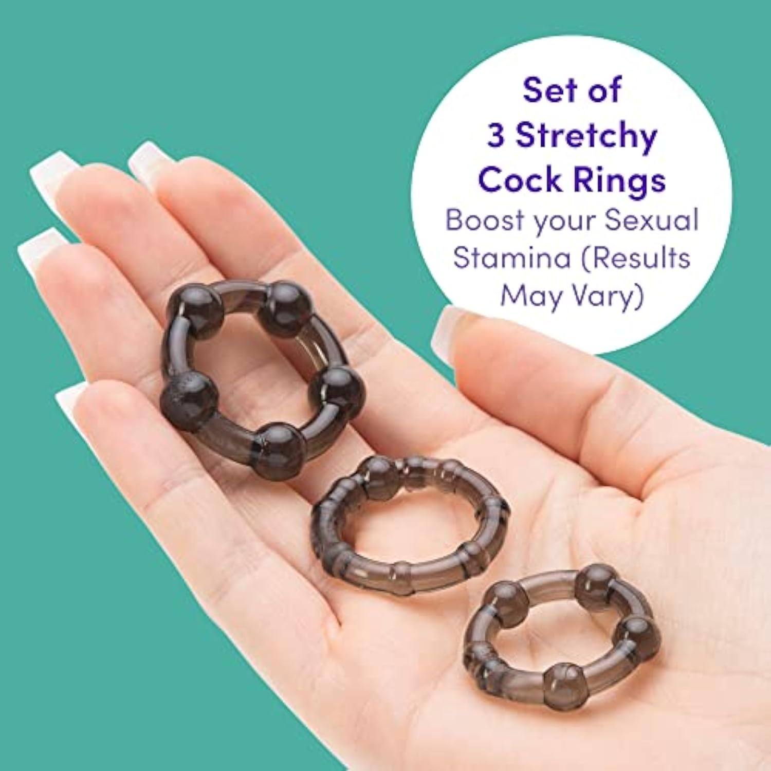 | Set Of 3 Stretchy Cock Rings Boost Your Sexual Stamina (Results May Vary): Stretchy And Flexible, This 3 Pack Of Cock Rings Are Designed To Help Enhance Erections And Optimise Staying Power. No S, As Results May Vary, But We Think You’Ll Like Them. | | Smooth Nubs On Each Ring Stimulate Partner During Penetration: These Cock Rings Each Feature Raised Nodules And Bumps For Heightened Sensation, And For Adding Clitoral Or Perineal Stimulation During Penetrative Sex. | | Wear In Different Combinations For Pleasurable Constriction: Apply A Good Squeeze Of Water-Based Lube To Yourself And The Inner Surface Of Your Chosen Cock Ring And Slide It To The Base Of Your Penis. | | Stretchy And Flexible To Fit Most And Can Be Used Again And Again: As You Become Harder, You'Ll Experience Gentle Pressure And Should Notice That Your Erection Is Bigger And Stronger Than Usual. Stretchy And Flexible, Penis Rings Will Fit Most Men And Can Be Used Again And Again. | | Waterproof:Submersible: Great For The Bedroom, And You Can Also Enjoy Your Cock Rings In The Bathroom. Ideal For Use In The Shower Or Bath, Enjoy Aquatic Exploits And Adventures With These Couples Sex Toys 100% Water Submersible Design. | |