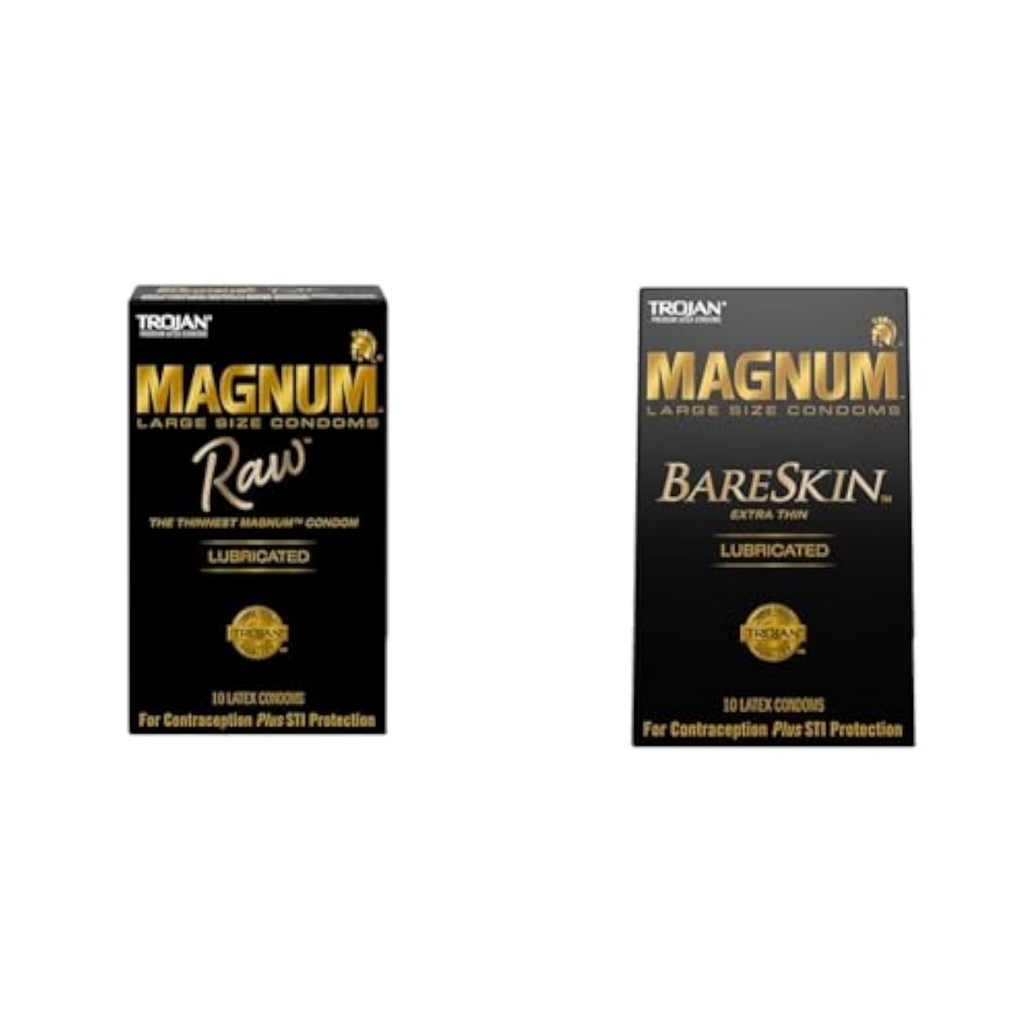 | The Gold Standard - Thinnest MAGNUM condoms from TROJAN brand for heightened sensitivity and comfort in a wider, contoured shape. | | Contains 10 TROJAN MAGNUM RAW and 10 TROJAN MAGNUM BARESKIN large condoms with silky smooth lubricant for extra comfort. | | Larger condoms provide more room with tapered base for secure fit and special reservoir end for extra safety. | | Made from premium latex, electroni