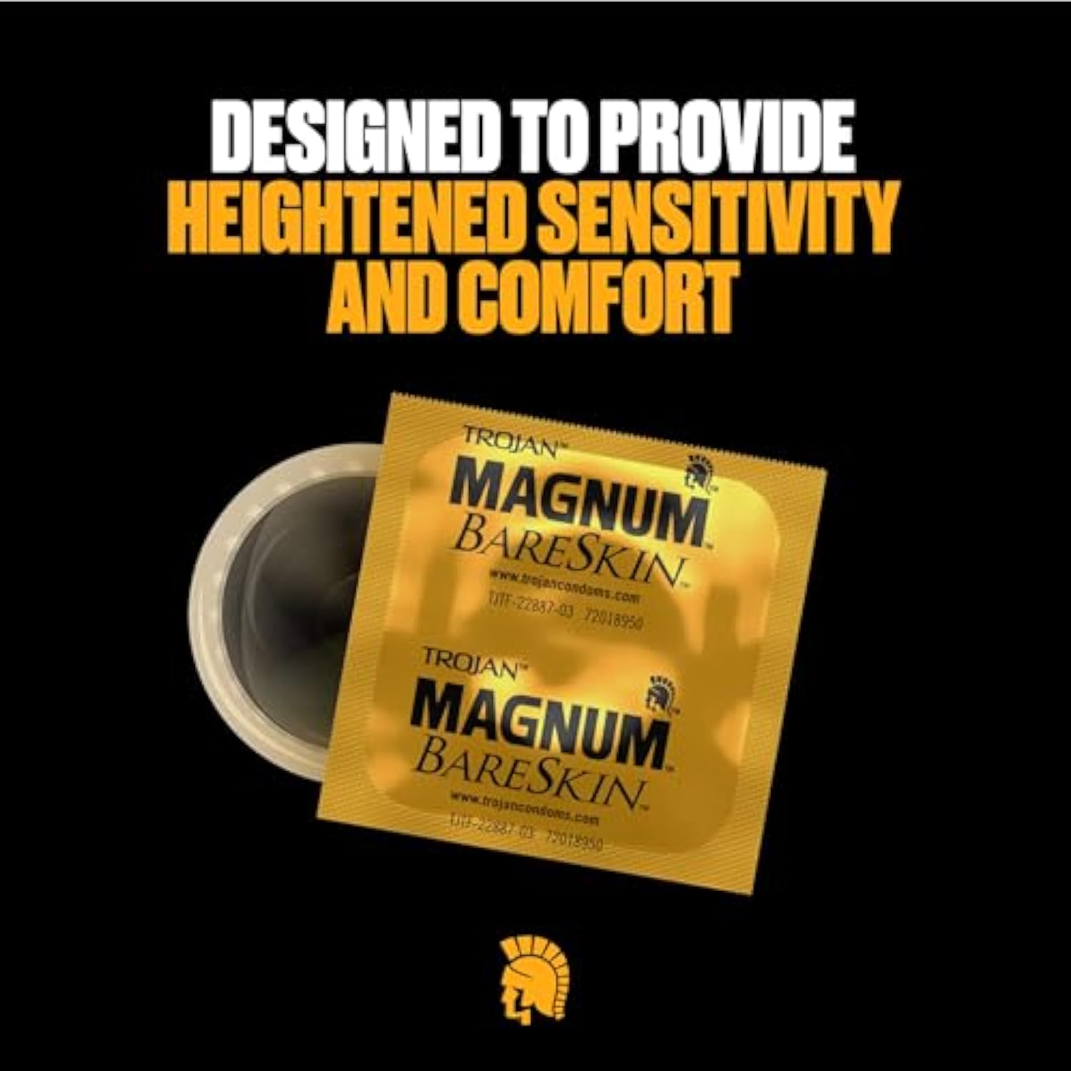 | One 10 count box of TROJAN MAGNUM condoms, bareskin condoms large size | | Extra thin condoms TROJAN with silky smooth lubricant ensures extra comfort and sensitivity | | MAGNUM large condoms are bigger than the standard condom with a wider, contoured shape and a special reservoir end for extra safety and a tapered base for secure placement | | The Gold Standard - Thinnest MAGNUM condom from TROJAN for heightened sensitivity and comfort | |