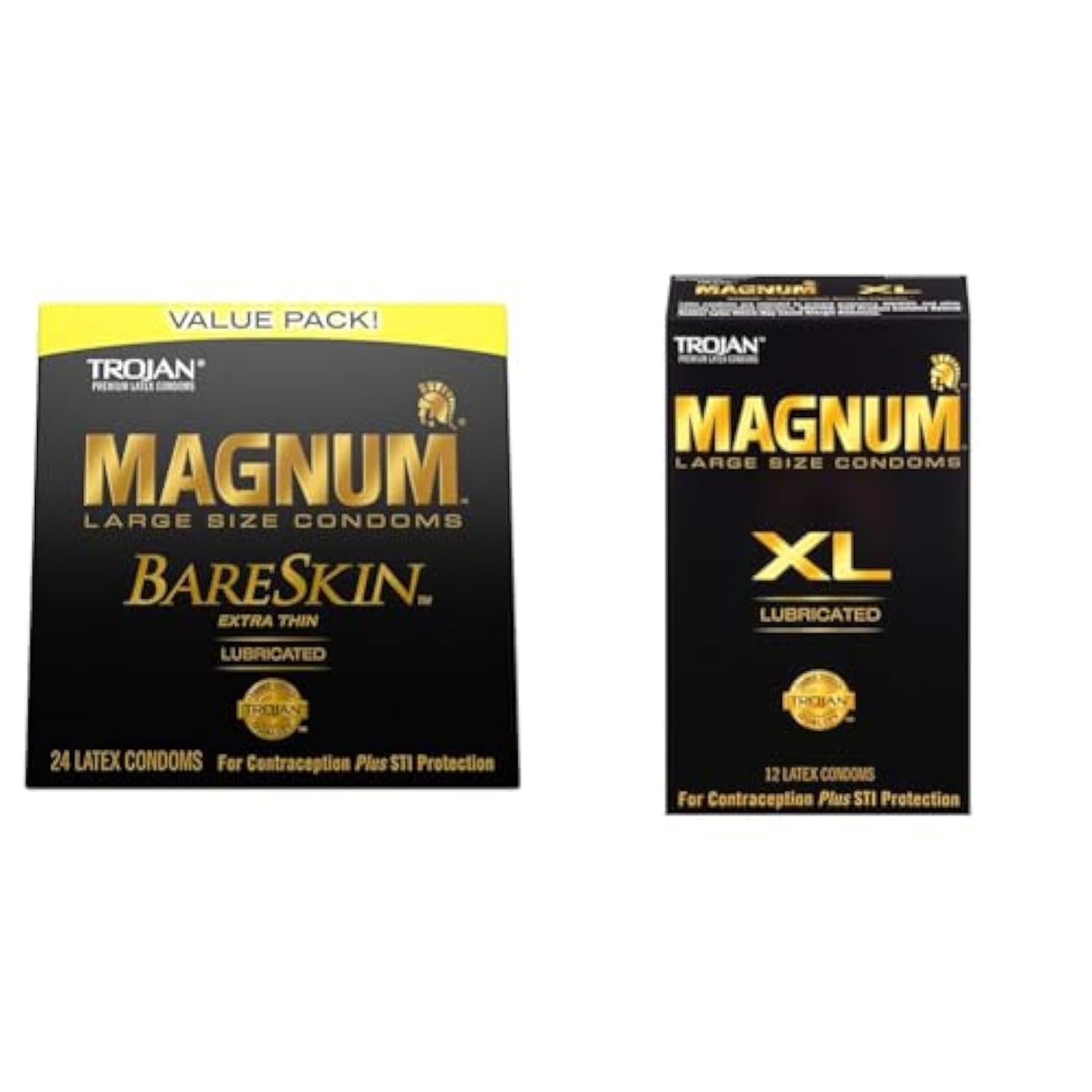 TROJAN Magnum BareSkin Premium Large Condoms, Comfortable and Smooth Lubricated Condoms for Men, America’s Number One Condom, 24 Count Value Pack & Magnum XL Large Size Lubricated Condoms - 12 Count