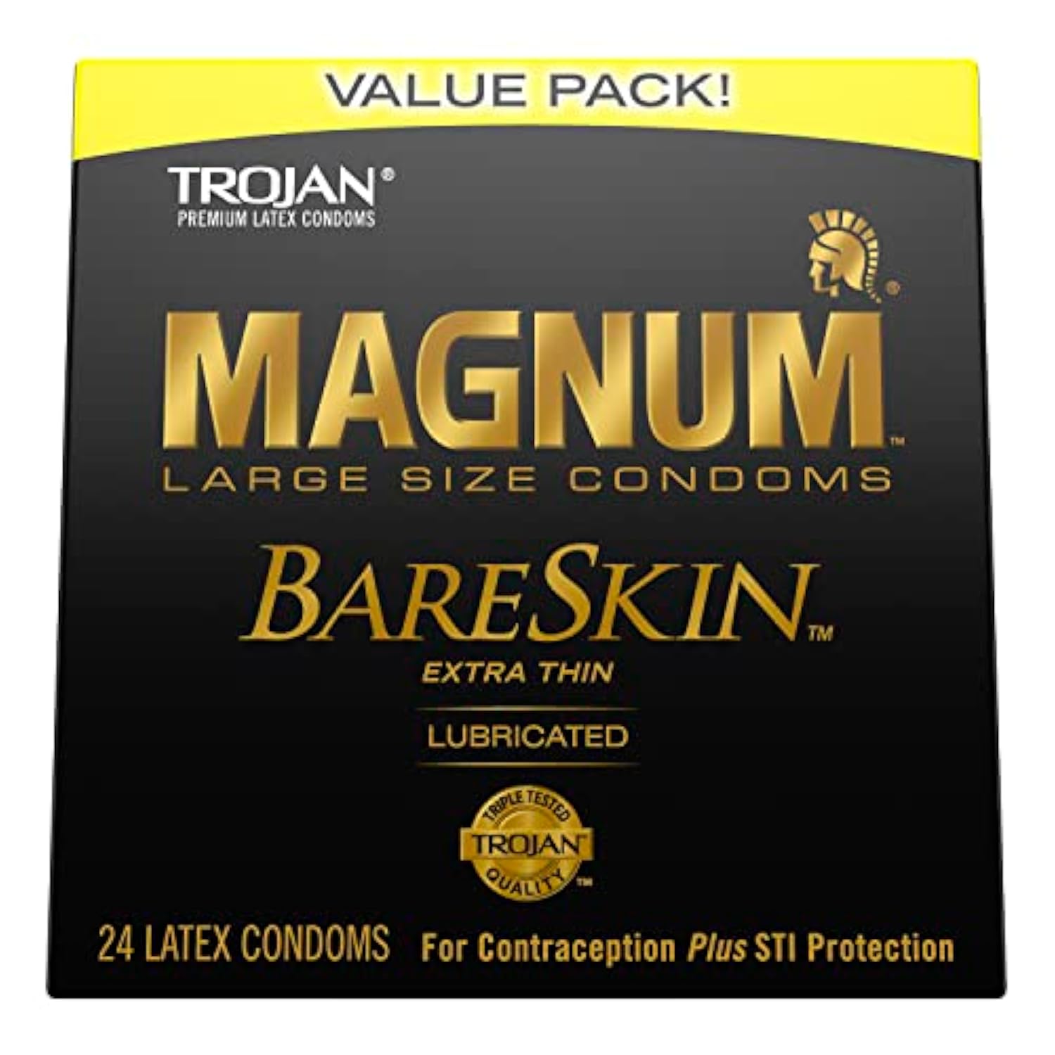 | Product 1: One 24 count box of TROJAN Magnum BareSkin Large Size Lubricated Condoms with a contoured shape for added comfort, silky-smooth lubricant and thin design to provide heightened sensitivity | | Product 1: Magnum Large Condoms are larger than the standard latex condoms with a wider, contoured shape for men who need a little more room, plus a special reservoir tip for extra safety and a tapered base for secure placement | | Product 1: The thinnest Magnum Condoms from TROJAN are 20 percent thinner than regular Magnum Lubricated Condoms and still feature a silky-smooth lubricant to help provide heightened sensitivity and comfort every time you play | | Product 1: These thin condoms for men are made from premium latex and electroni