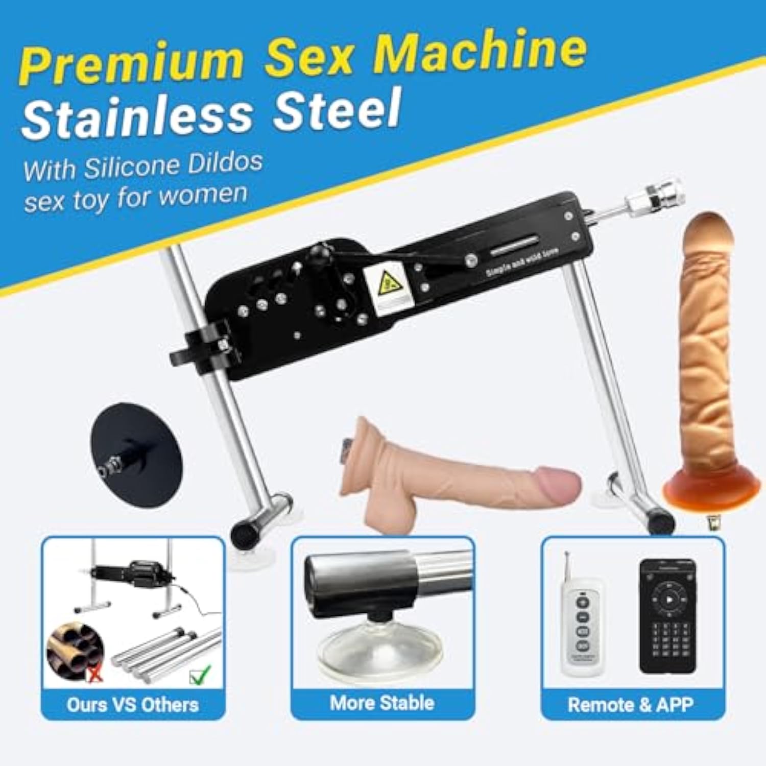 | App Control Remote Control Dildo Machine: This Automatic Sex Machine Thrusting Speed Can Be Adjusted Freely Through The Remote Control Or App On Smartphone,Which Will Make Your Operation More Convenient To Realize The Pleasure Of Freeing Your Hands; The Automatic Thrusting Speed Range Is 0 To 400 Times Per Minute,Enjoy Endless Sexual Exploration With Its 18 Different Modes And Various Sex Machine Dildos | | Angle Adjustable Easy To Use: The Angle Of The Thrusting Sex Machine Can Be Adjusted Quickly,From -45 Degrees To +60 Degrees Quickly And Flexibly. The Height Difference At Both Ends Will Lead To Different Posture Changes, Whether You Are Kneeling Or Lying Down, You Can Adjust The Angle According To Your Own Preferences, Try And Explore New Positions, Say Goodbye To Monotonous Sex Life, Enjoy The Fun Of Different Positions;Easy To Install,O-Shaped Support Clamps Make Assembly, Adjustment, And Transport Super Convenient.Remove And Store, Also Easy To Familiarize Yourself With The Operation(English Instruction Included In The Package) | | Powerful And Silient Motor Automatic Thrusting Machine: The 70W Turbo Motor Of This Quiet Sex Machine Produces A Powerful Penetration Many Times Stronger Than A Regular Machine For The Most Intense Sex Satisfaction. High Speed Impacts With Low Noise Less Than 30 Db, Ensuring That You Enjoy A High-Quality Sex Without Interference | | Non-Slip Enhancement - With Its Higher-Quality Aluminum Alloy Body And Sturdy Stainless Steel Support Rod,This Sex Machine For Women Also Has Been Upgraded To Suction Cup Non-Slip,(Comparing To The Old Style Machine Not Have Four Suction Cup Feet) ,Which Means It Will Not Cause Any Displacement Or Vibration Even At The Highest Speed And Shock.(Smooth Floors,Tile And Glass Tables Are Recommended To Be Placement) | | Discreet Package Sex Toy: This Masturbation Machine Contains 2 Quick-Air Interface Dildos And One Suction Cup Adapter Which Allow You To Use Your Own Suction Dildo Toys, You Can Simply Enjoy More Pleasure At Bedroom Alone Or With Your Partner ; All Products Are Packaged In A Discreet Way To Ensure Your Privacy And Safety | |