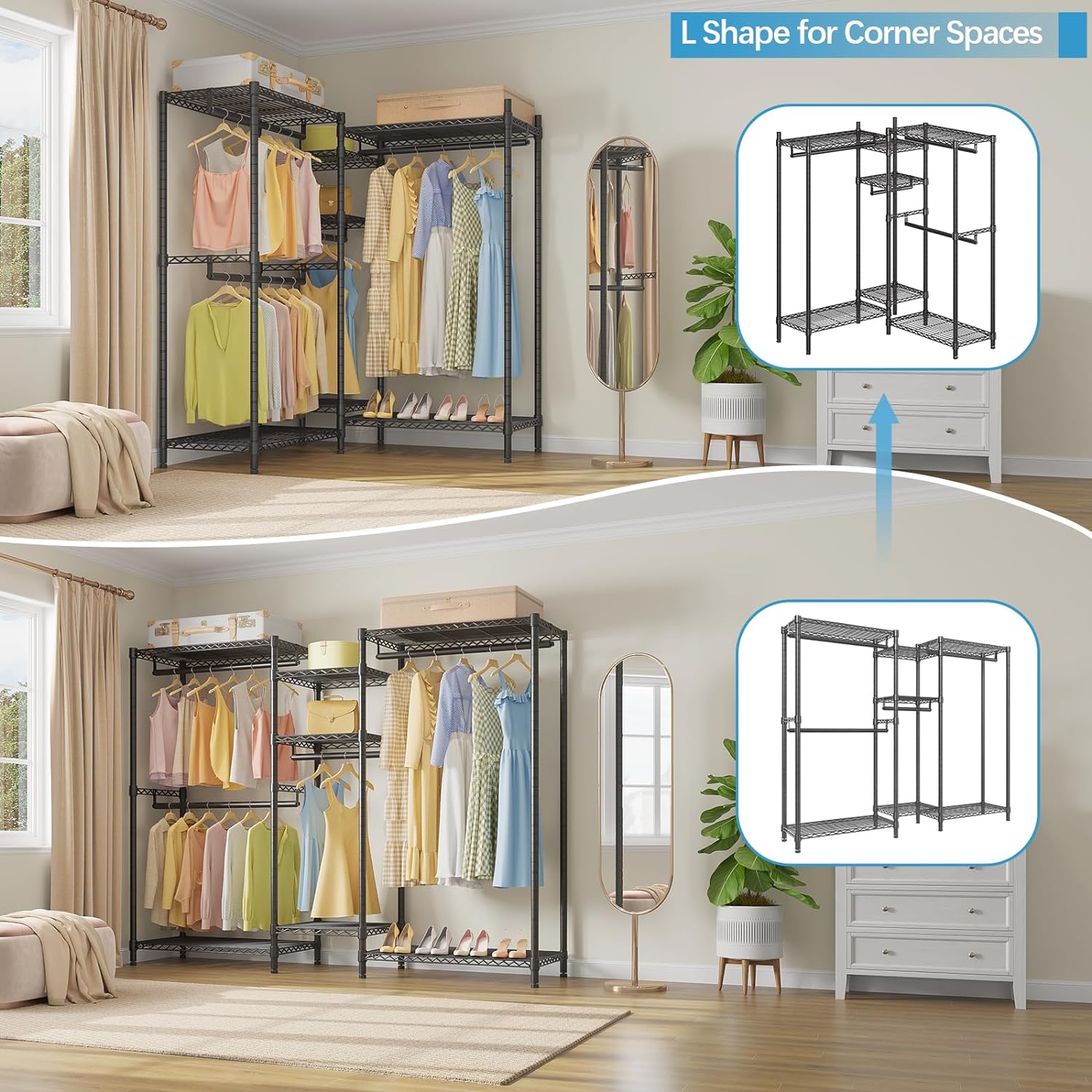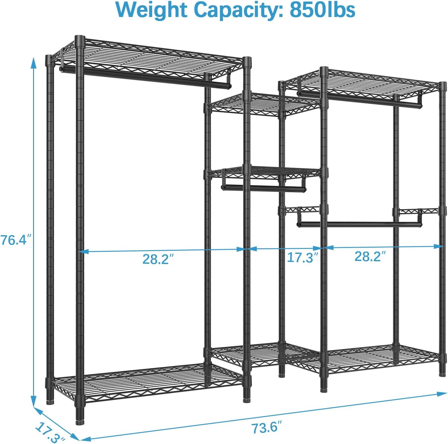 V6 Wire Garment Rack Heavy Duty Clothes Rack Metal with Shelves, Freestanding Portable Wardrobe Closet Rack for Hanging Clothes 73.6" L x 17.3" W x 76.4" H, Max Load 850LBS, Black
