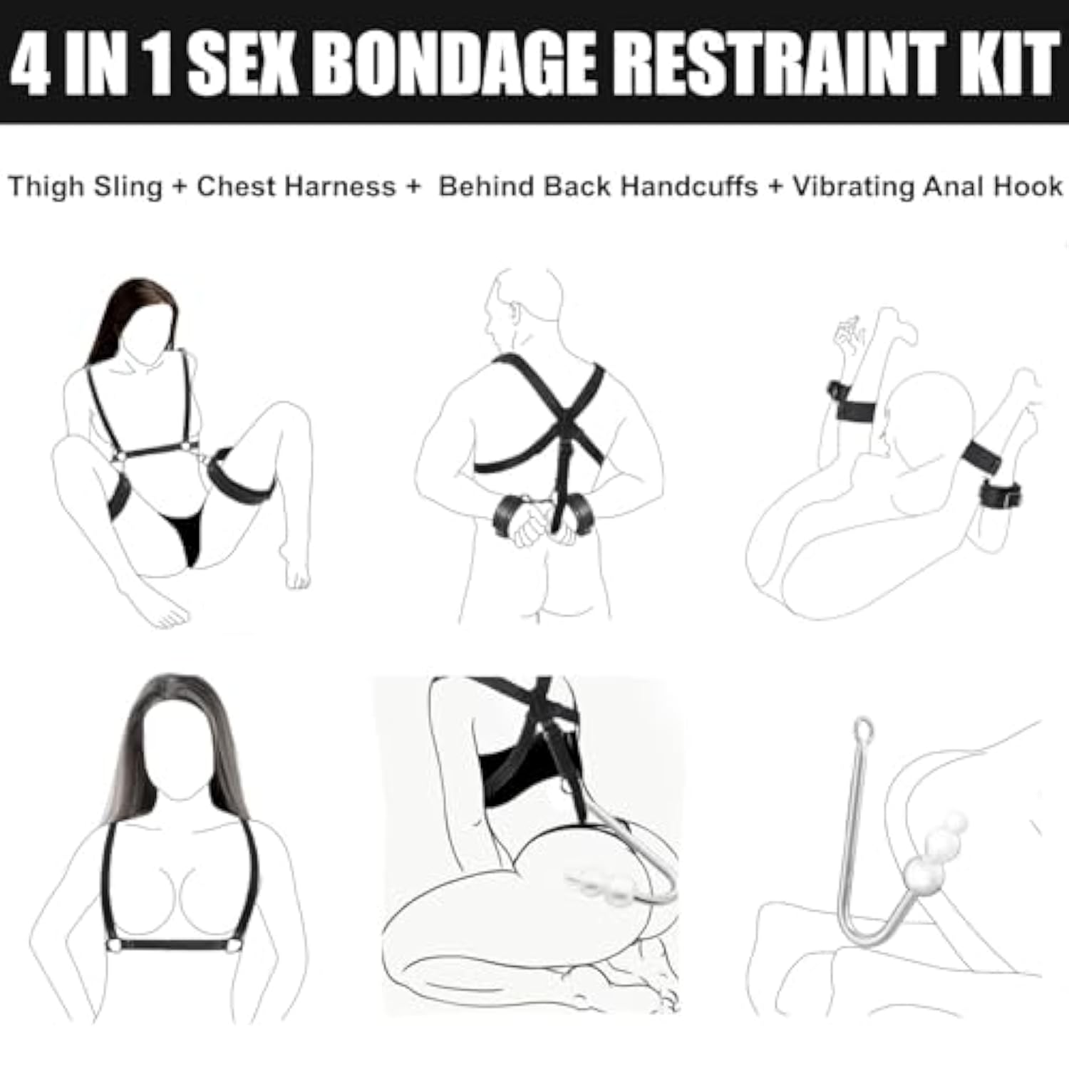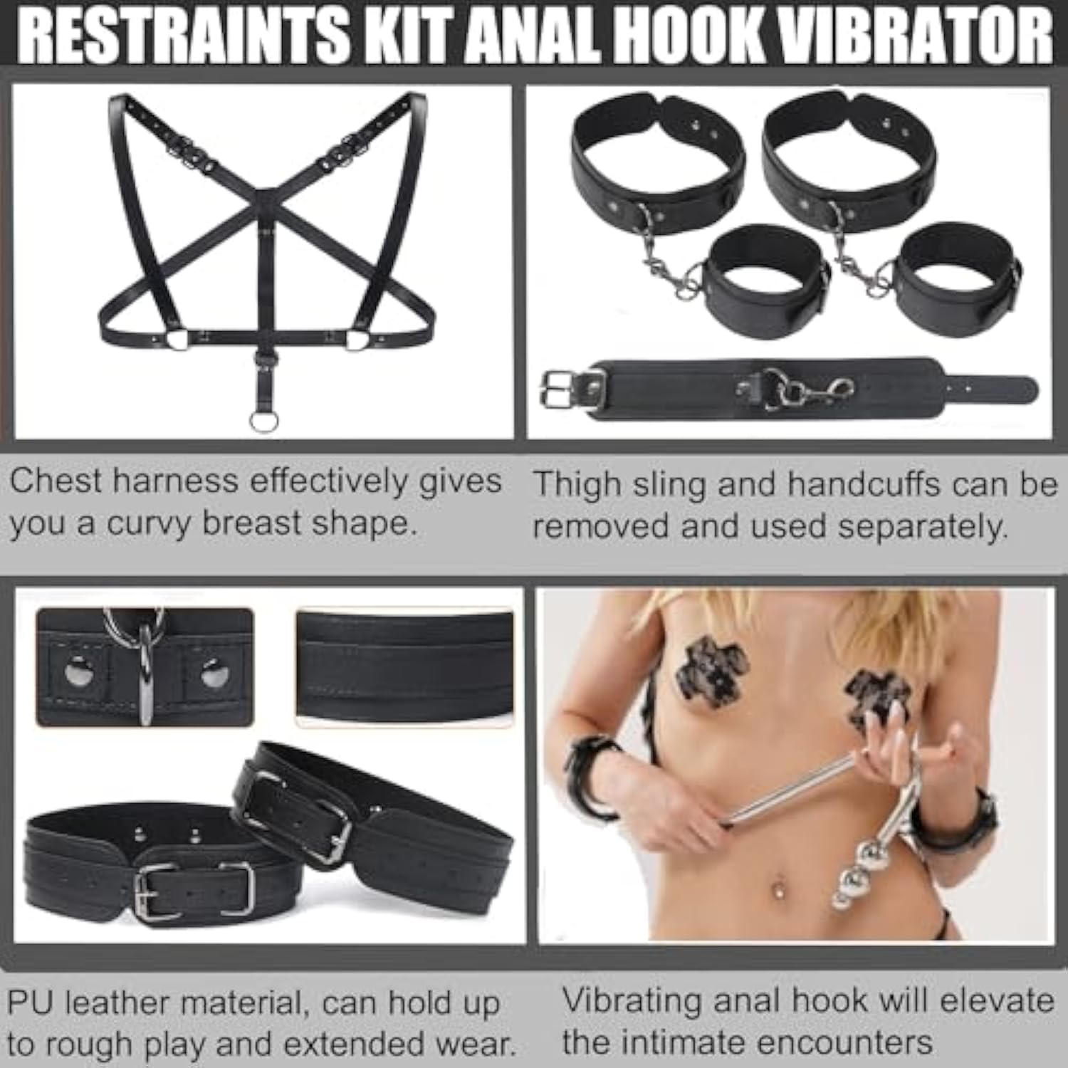 | 4 In 1 Vibrating Anal Hook Sex Bondage Set: 4-In-1 Bdsm Reversible Restraint Kit Of Thigh Sling, Chest Harness, Behind Back Handcuffs And Vibrating Anal Hook. The Anal Hook Can Be Hooked Up Other Bondage Toy To Provide Anal Stimulating And Multiple Orgasms. The Anal Trainer Set Supports Various Sexual Positions, Elevate The Intimate Encounters, The Slave Will Be Wide Open To Accept Tease And Torment | | 9 Vibration Modes Anal Trainer Vibrator: The 3 Balls Anal Hook Vibrator Is Equipped With Super Motor, 9 Different Vibration Modes, From Mild To Wild, Enjoy The Thrill Of Passion From Firming To Relaxing. The Anal Plug Vibrator With 3 Anal Beads Of Different Sizes, From Small To Large, From Shallow To Deep, The Sphincter Muscle Slowly Relaxes And Opens, Gradually Stimulates Libido | | Premium Material For Ultimate Comfort: The Premium Pu Leather Bdsm Kit And Stainless Steel Vibrating Anal Hook , Make This Unisex Sex Toy Soft, Safe And Comfortable, Can Hold Up To Rough Play And Extended Wear, Will Keep Them Comfortable Through The Long Hours Of Your Pleasing, Teasing, And Tormenting | | Get Into Perfect Position For Penetration: All Of The Thigh Sling, Handcuffs, Shoulder Belt And Back Straps Are Adjustable To Fit Your Size. Adjust The Straps On The Back And Connect The Adjustable Handcuffs To Keep The Arms Behind. Bring Their Knees Up To Their Chest With The Thigh Strap To Leave The Private Parts Completely Vulnerable And Exposed, Facilitate Insertion | | Spice Up Your Erotic Lif: The Restraints Kit With Butt Plug Vibrator Is A Unique Device Which Can Be Used To Explore The Joy Of Cosplay, Bondage And Discipline, Dominance, Submission Teasing-Yet-Torturous Fun, Can Wake Up Fantasy To The Limit. The Sm Fetish Sex Toy Is Discreetly Packaged ,Easy Storage And Protect Your Privacy | |
