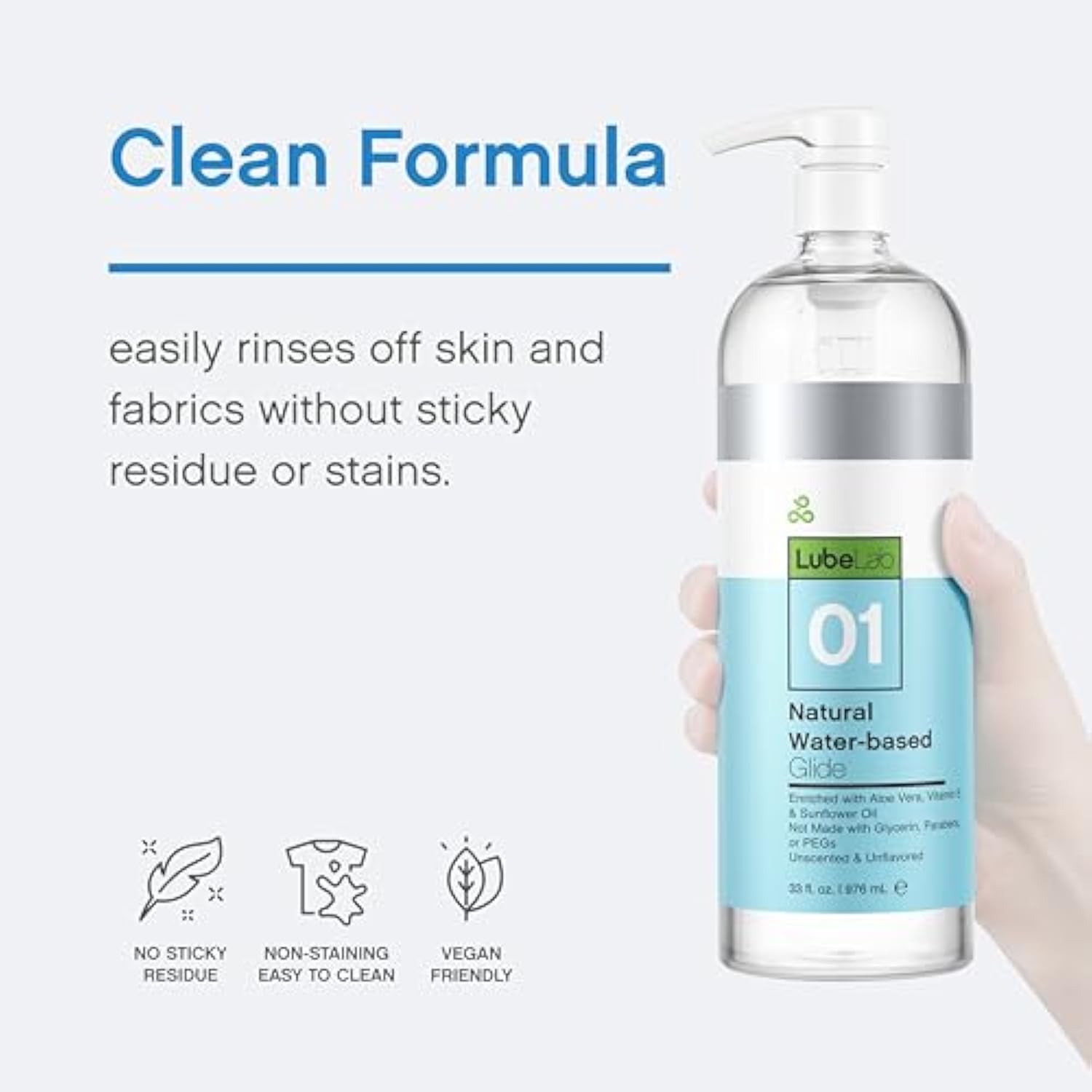 | Silky-Smooth Formula: Enriched With Organic Aloe Vera, Vitamin E, And Sunflower Oil, Providing An Effortless Glide Experience That Feels Like Second Nature; This Non-Staining, Water-Based Lube Rinses Off Easily Without Leaving Sticky Residue | | Hypoallergenic Vegan-Friendly: Tested On Consenting Adults, This Lubricant Is Verified To Be Safe On Your Body; It'S Made Without Parabens, Glycerin, Pegs, Drying Alcohol, Gluten, And Animal-Derived Ingredients; Unscented, Unflavored, And Gentle On All Skin Types | | Ph-Balanced: Specially Formulated To Complement Your Body’S Natural Chemistry, Elevating Comfort And Maintaining Your Body'S Natural Balance | | Massive Value: Get More Of What You Love With Generous 33 Fl Oz (976 Ml)—’S Largest-Ever Offering! | | Convenient Pump Dispenser: Features A Durable, Shower-Proof, Lockable Pump For Easy, One-Hand Application; Perfect For Bathroom Use Or Safe Transportation | | Developed In A U.S. Lab: Scientifi
