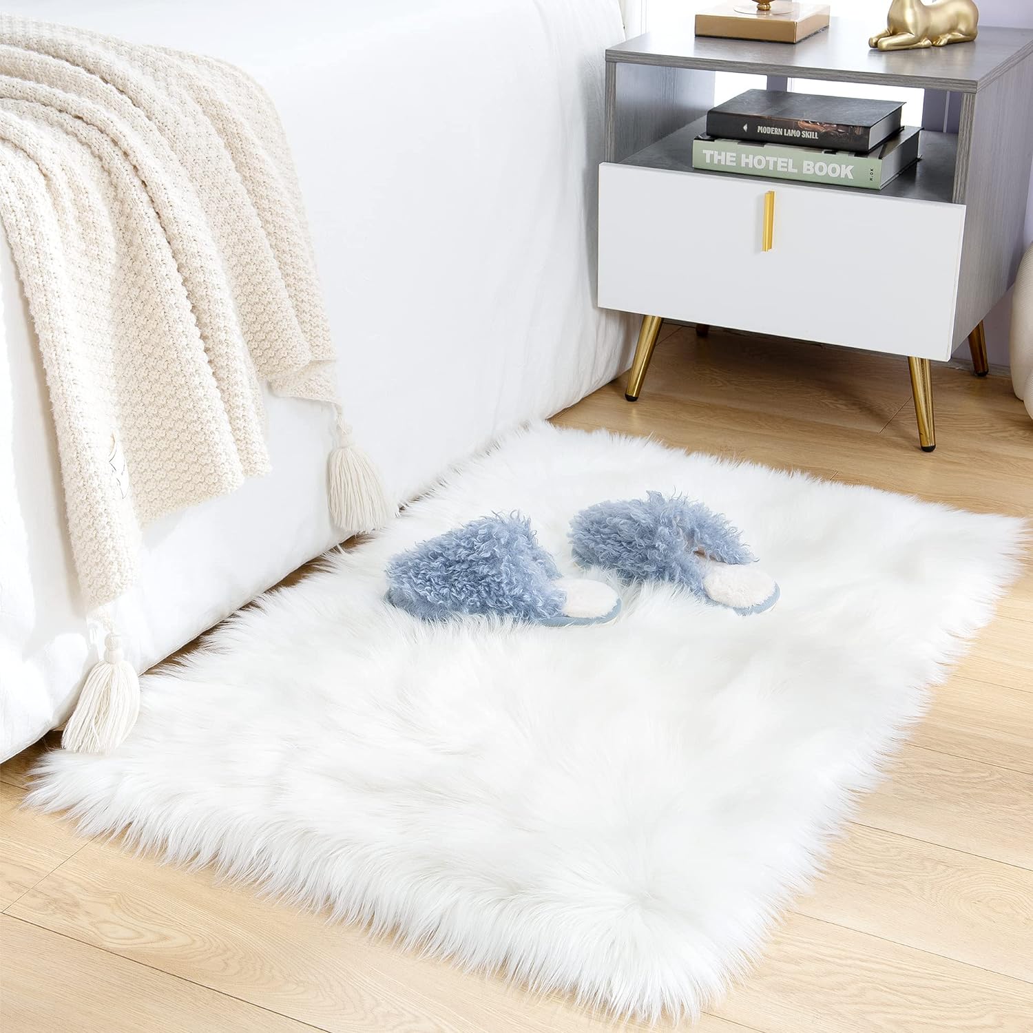 - Super Soft Faux Fur Rug : Our upgraded bedroom rugs are made of high quality and durable faux sheepskin fur.Super thick and soft to the touch gives our fuzzy rugs a super fluffy feel.2.8" pile height gives you a comfortable and warm cushion on cold floors or your hard chair.